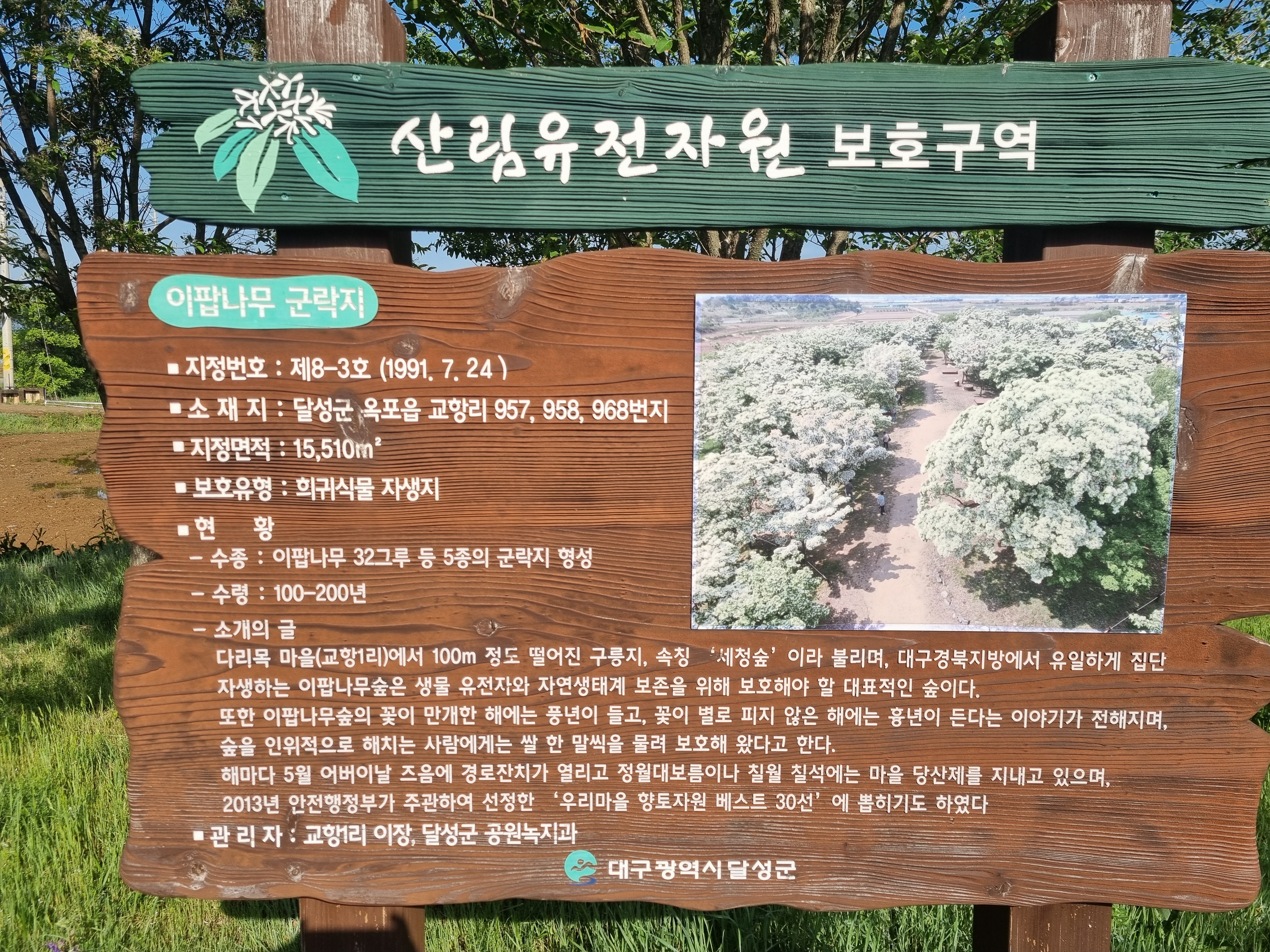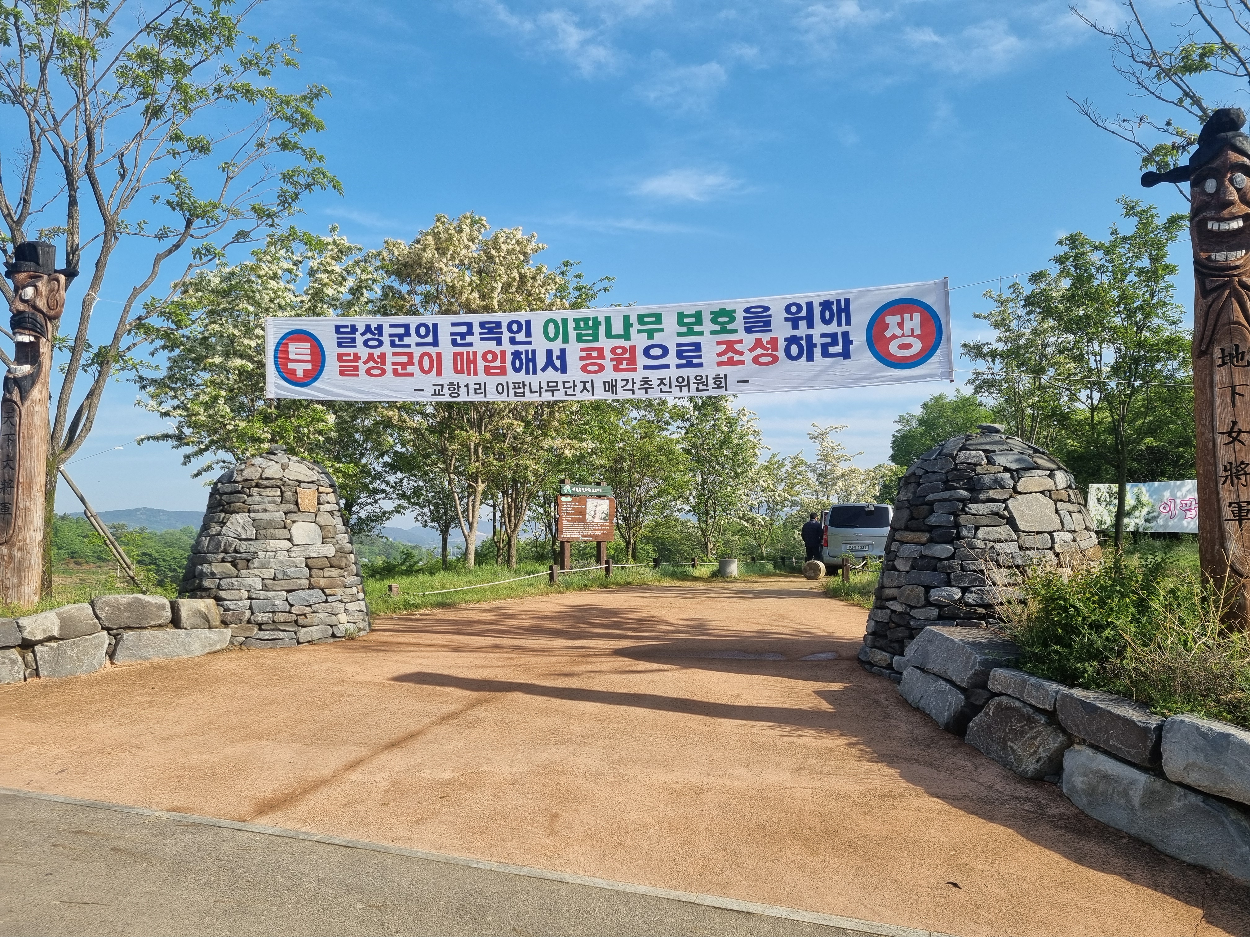 달성군에 이팝나무 군락지가 있다고 해서 봄이 가는 것이 아쉬워 이른 아침에 방문을 하였다. 이팝나무 군락지 입구에 공원을 조성하라는 현수막이 걸려 있고, 투쟁! 이라는 용어가 싱그러운 봄의 아침과는 대조적으로 보였다.