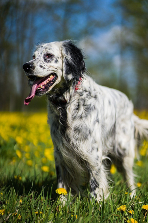 세터라는 이름은 ‘앉다’라는 뜻을 가진 ‘set’에서 유래했는데, 이는 세터가 사냥감을 찾았을 때 정지하고 앉는 자세를 취하기 때문입니다. 그 당시 세터는 ‘사냥감을 세팅하는 개’로, 일정 거리에서 사냥감을 발견하면 주인에게 이를 알리기 위해 앉는 행동을 했습니다. 이러한 특성 덕분에 잉글리시 세터는 사냥에 매우 유능한 동반자로 자리 잡았습니다.