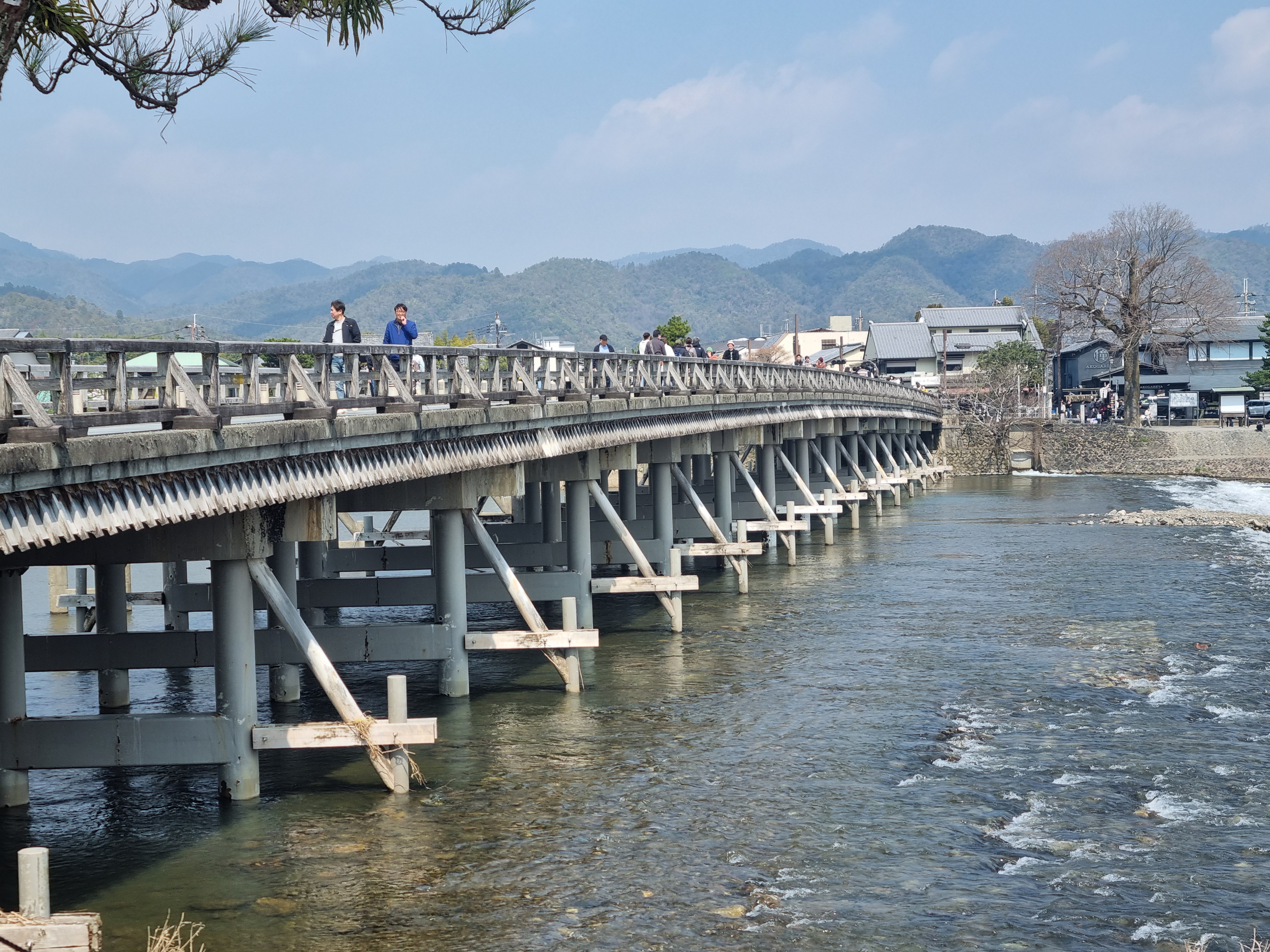 아라시야마의 상징적인 다리로, "달을 건너다"는 뜻을 가진 이름을 가지고 있습니다. 이 다리는 강을 가로지르며, 주변 산과 자연 경관이 아름답게 어우러져 있어 많은 관광객이 이곳에서 사진을 찍고 풍경을 감상합니다.