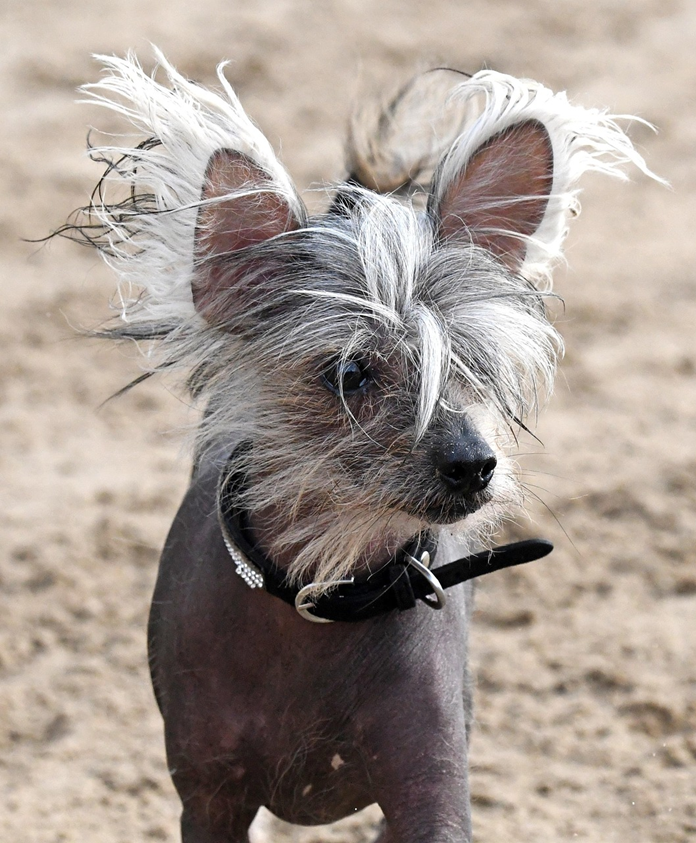 차이니스 크레스티드의 가장 큰 특징은 바로 털이 없는 피부와 머리, 발, 꼬리 부분에만 털이 나는 독특한 외모입니다. 털이 없는 부분은 매끄럽고 부드러운 피부를 자랑하는데, 이 부분은 피부를 보호할 수 있도록 자외선 차단제를 사용해 주어야 합니다. 반면, 털이 있는 부분은 주로 길고 부드러운 털로 덮여 있으며, 특히 귀와 발에 있는 털은 매우 특징적입니다.