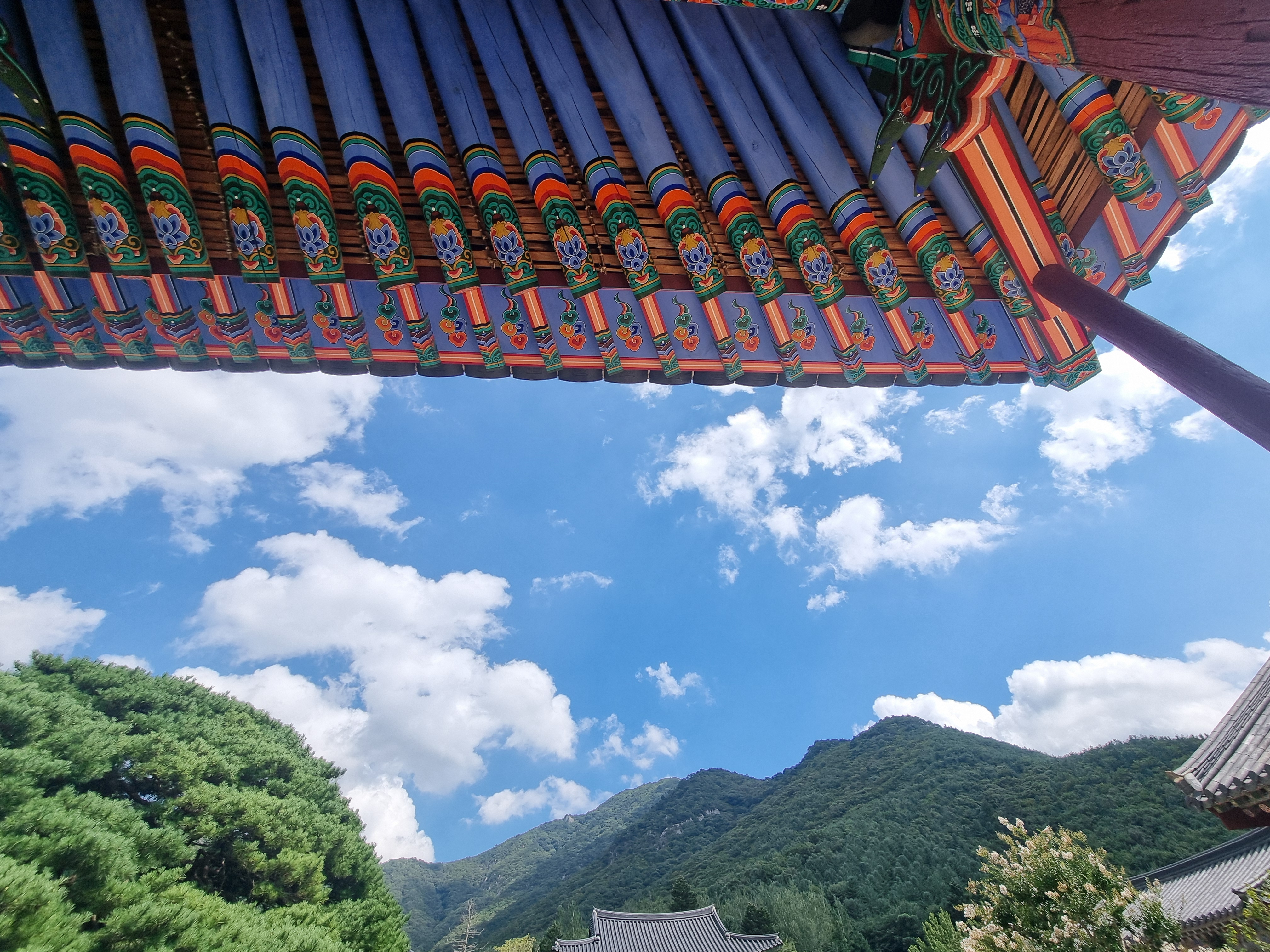 만세루의 단청과 파란하늘과 흰구름, 녹색의 산, 절 지붕이 아주 선명하게 다가온다.